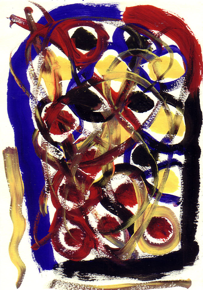Painting above by Tony Reid (1998), during a facilitated art session with artist Andrew James Campbell.  Courtesy of Andrew James Campbell and permission to use.  The painting represents in a spectacular way the creative emergence that took place over the three day workshop.
